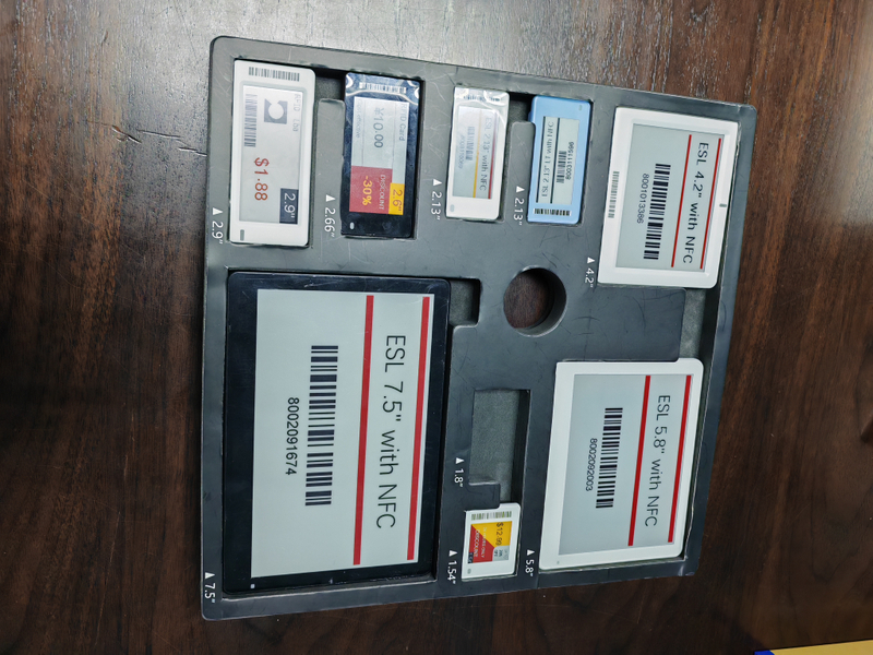 ESL Tags: 1.54-inch, 1.8-inch, 2.13-inch, 2.66-inch, 2.9-inch, 4.2-inch, 5.8-inch, 7.5-inch, 10.2-inch sizes; black and white, black and white with red, or black and white with red and yellow color schemes; removable battery.